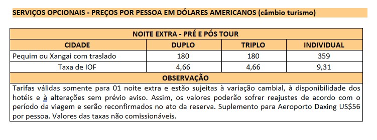 * Bilhetes aéreos nos trechos internos, em classe econômica, com emissão local, nos trechos Pequim/ Xian/ Guilin/ Hangzhou, franquia de bagagem: máximo 01 mala de até 20kg por pessoa;
