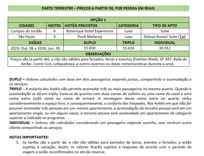 • A tradicional gorjeta ao guia e/ou motorista, carregadores de malas, camareiras e etc., a critério de cada passageiro;