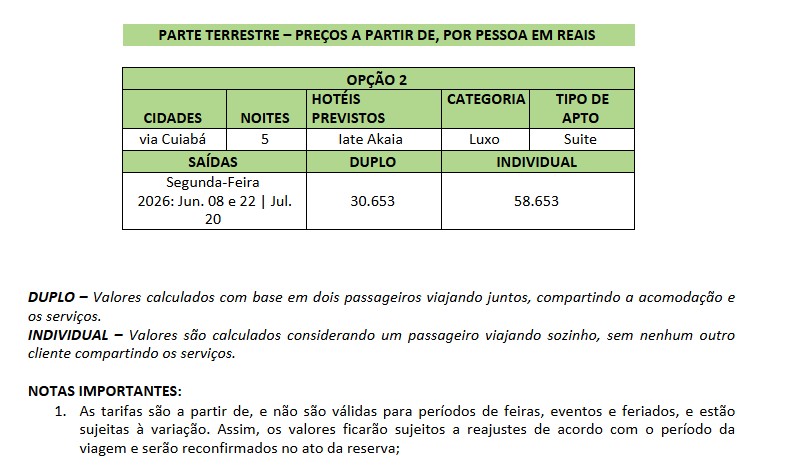 Os preços de qualquer programa de turismo nacional variam mês a mês com suplementos/descontos na parte aérea e/ou terrestre, em épocas de alta/ baixa temporada. Há, ainda, as oscilações e/ou alterações de valores pelos próprios fornecedores.