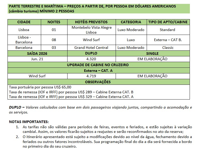 * 08 noites de hospedagem a bordo do Wind Surf;