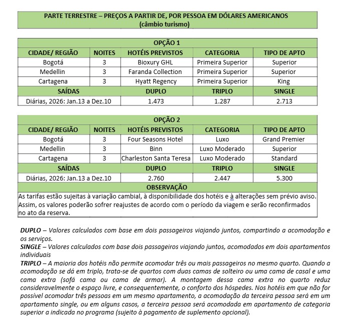 * Bilhetes aéreos nos trechos Bogotá / Medellín / Cartagena e qualquer outro trecho internacional ou doméstico (consulte-nos sobre as melhores tarifas);