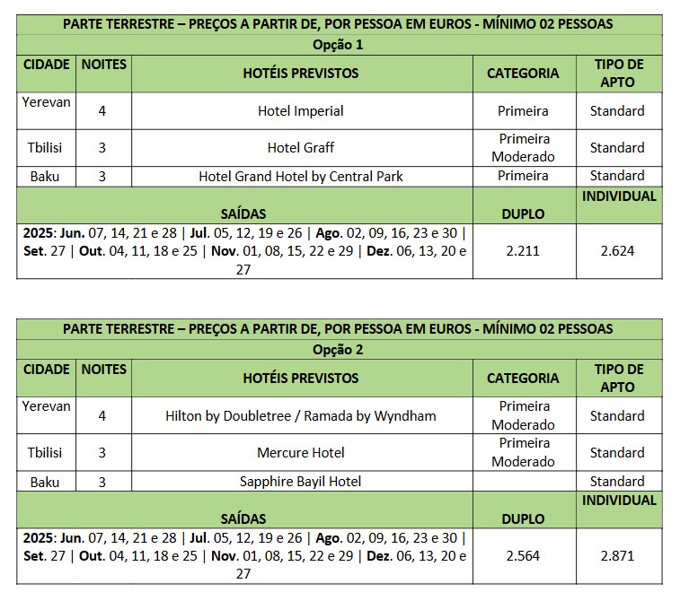 * Traslado de chegada em Yerevan e saída para o aeroporto de Tbilisi e chegada e saída em Baku;