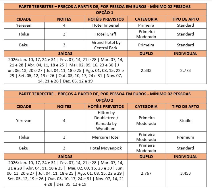 * Traslado aeroporto/ hotel em Yerevan e hotel/ aeroporto em Tiblissi conforme especificado no roteiro, em serviço a compartir com demais passageiros;