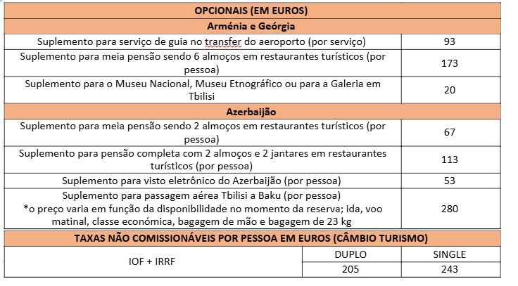 * Acompanhamento de guia falando espanhol durante o roteiro (exceto no dia de chegada na Armênia e no dia de saída da Geórgia);
